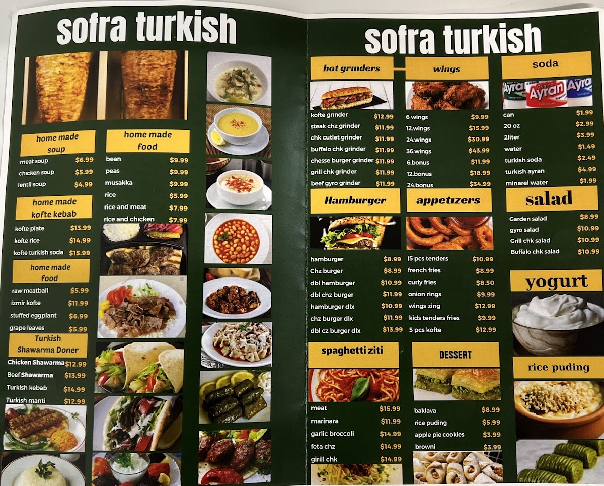 Sofra Turkish Mediterranean Grill offers a diverse and flavorful menu with options that cater to various tastes. For burger lovers, the Hamburger ($5.99), Cheeseburger ($6.99), Hamburger Deluxe ($7.99), and Cheeseburger Deluxe ($8.99) are popular choices, alongside the hearty Double Burger ($9.99). The hot grinders section includes satisfying sandwiches like Turkey & Cheese ($7.49), Buffalo Chicken ($7.99), Steak & Cheese ($8.49), Chicken Cutlet ($7.99), and Beef Gyro ($8.49). For those craving wings, there are options for 6 Wings ($6.99), 12 Wings ($12.99), 24 Wings ($22.99), and 36 Wings ($30.99), along with 6 Boneless Wings ($7.99). Appetizers like the 6 Pieces Tenders ($6.49), crispy French Fries ($2.99), Curly Fries ($3.99), and Onion Rings ($4.99) are perfect for starting your meal. For a heartier dish, you can enjoy the classic Spaghetti or Ziti with your choice of Marinara ($7.99), Meat ($8.49), Garlic ($8.99), Chicken ($9.49), or Broccoli ($9.99) sauce. When it comes to desserts and beverages, Sofra offers sweet options like Baklava ($3.99) and cake ($3.99), along with refreshing drinks such as Mineral Water ($2.00), Turkish Ayran ($2.99), and Turkish Soda ($2.50). The menu provides a satisfying selection of Mediterranean-inspired dishes, perfect for a casual dining experience.